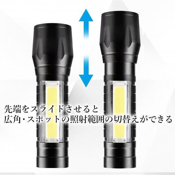 ・先端をスライドさせることで、広角、スポットと照射範囲を用途に合わせて切り替えができます。