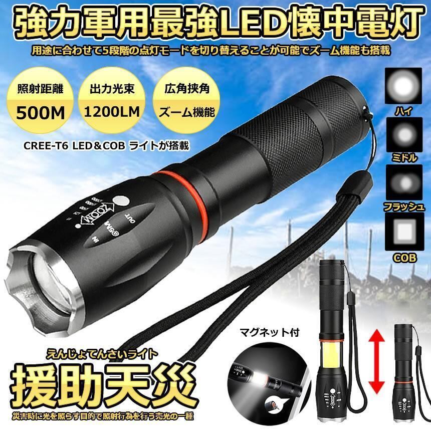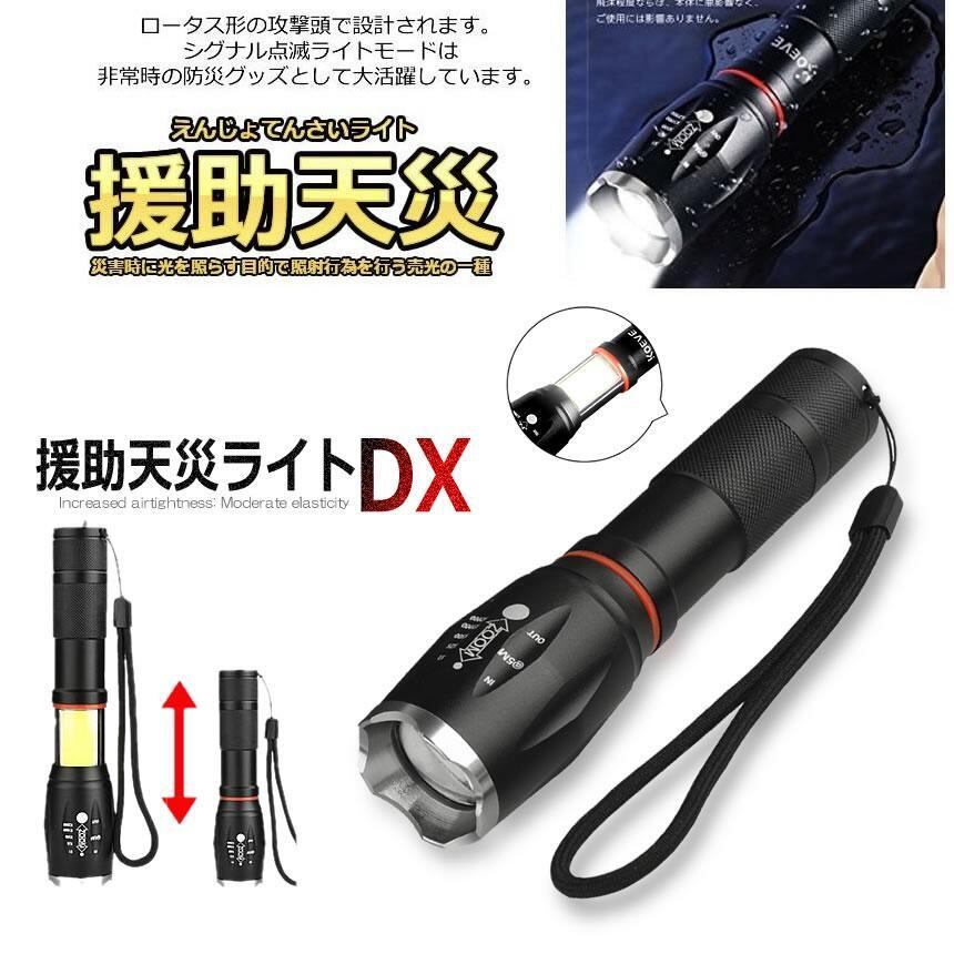 懐中電灯 充電式 LED 強力 軍用 最強 防災 点滅 停電 超高輝度 ハンディライト ズーム 18650 単四電池 対応 災害 震災 避難所 夜間 明るい ENTENLIGHT