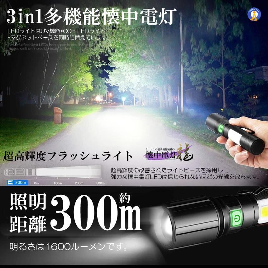 懐中電灯 LED 超高輝度 1600ルーメン ブラックライト COBライト USB充電式 2500mAh マグネット 7MODORAI