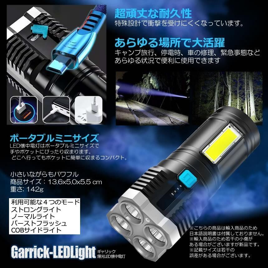懐中電灯 充電式 led 爆光 LED ライト 作業灯モード 超高輝度 200m キャンプ 防災 夜釣りハンディ サイドライトLED 災害 震災 避難所 夜間 GYARIKUHOU
