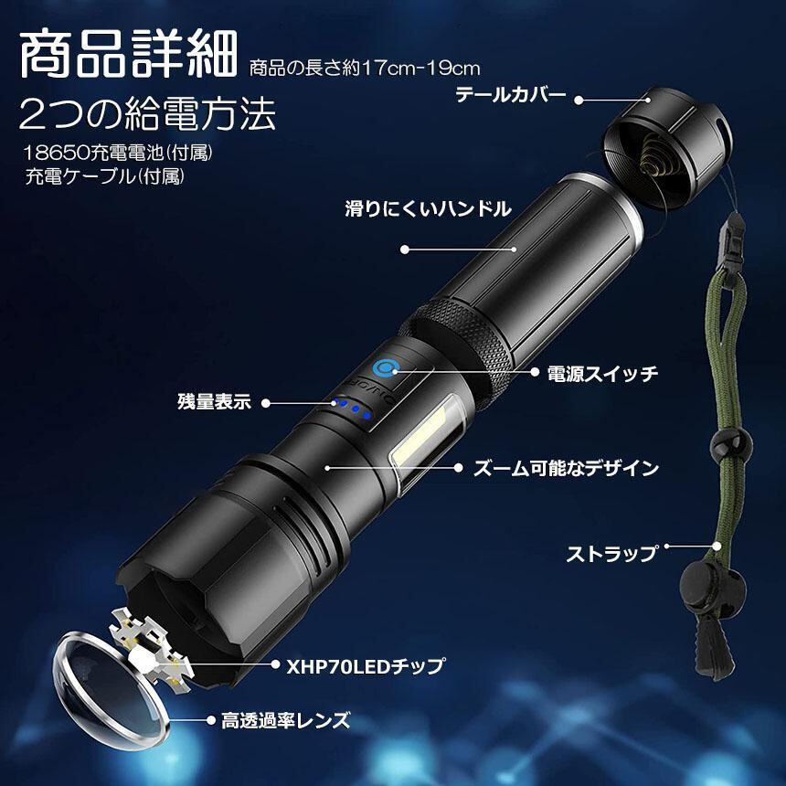 懐中電灯 ledライト XHP70 ハンディライト 7モード調光 強力 防水 USB充電式 電池式 LCD残量表示 ズーム機能 Type-C充電式 l