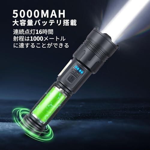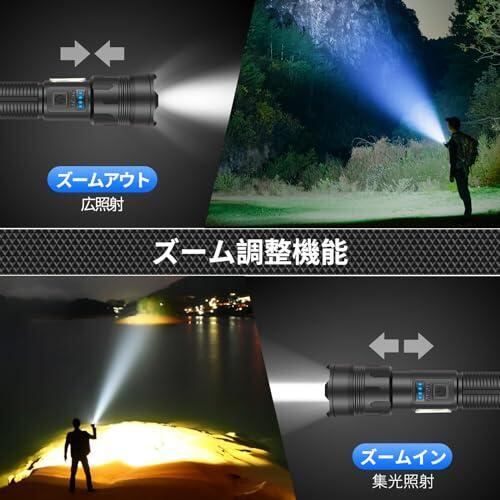 ・【超高輝度&7つのモード&ズーム機能】新世代の超高輝度2000ルーメンのLEDコンポーネントを採用した、XHP160のLED電球と組み合わせることで、より良い照明効果を達成することができます。照明距離は1000 mにも達することができます。7つのモードで調整できます。スイッチを押すと正面照射モードに入り、スイッチを素早く2回押すとCOB作業灯モードに入ります。いずれのモードも、スイッチを押すたびに、スモールモードに切り替えることができます。正面照射は強い光-弱い光-フラッシュの3モードで、COB作業灯は、高輝度-中輝度-赤色光-赤色閃光の4モードで、全部で7モードです。懐中電灯ズーム機能があり、ヘッドを軽くスライドせるだけで、広範囲の照明と遠距離の集光を自由自在に切り替えられます。