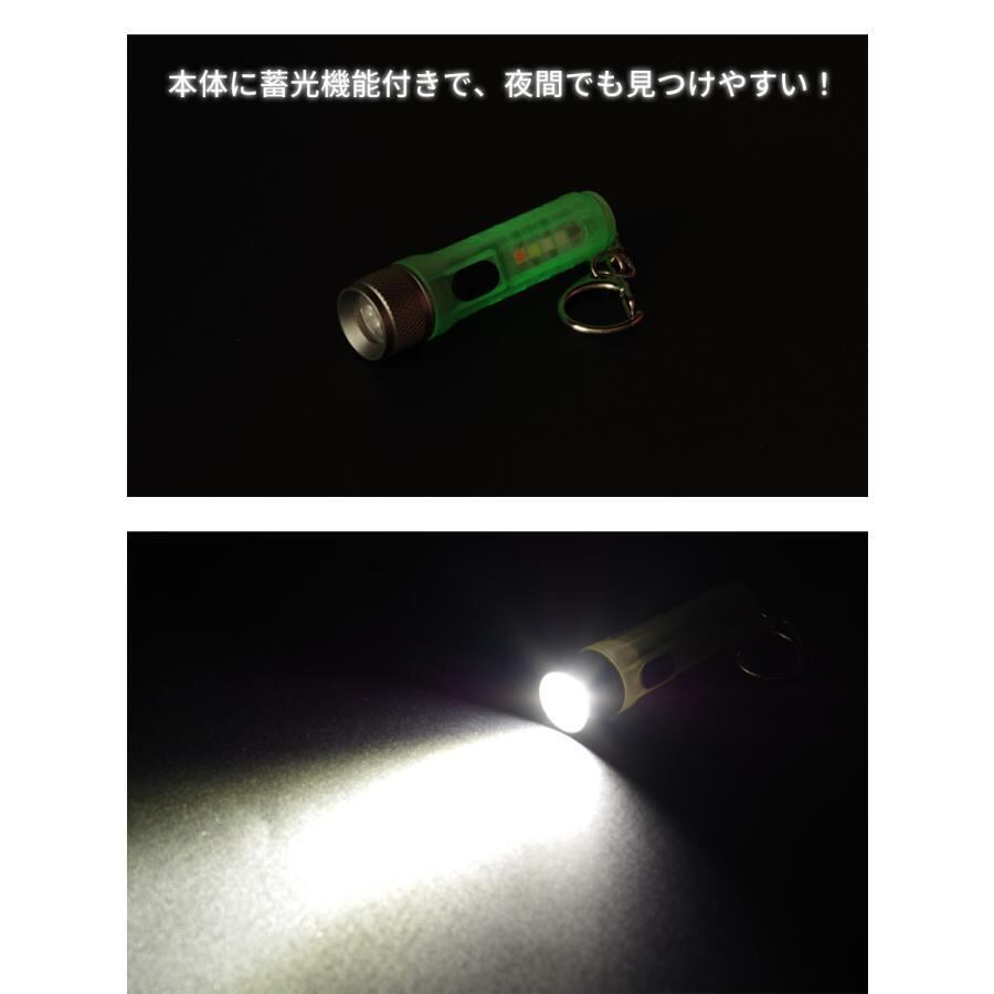 本体に蓄光機能を搭載し、夜間でも電源不要で光って見つけやすいLEDミニハンディライト。