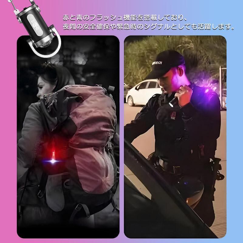 ■赤と青のフラッシュ機能搭載、安全確保や緊急時にも対応。