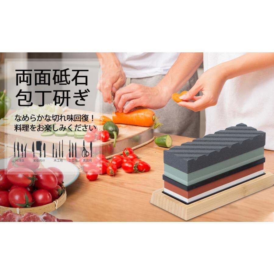 商品特長 ◎【両面砥石完全キット】#400荒砥石、#1000中砥石、#3000仕上砥石、#8000超仕上砥石。中砥石は切れ味が悪くなった時に使います、一般のご家族なら#1000、#3000があれば十分です。仕上砥石はより良い切れ味を追求したい時に使います。砥石を平らに保つための砥石面直し、砥石を固定する竹台、角度固定ホルダなどが付属しています。