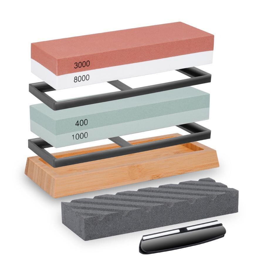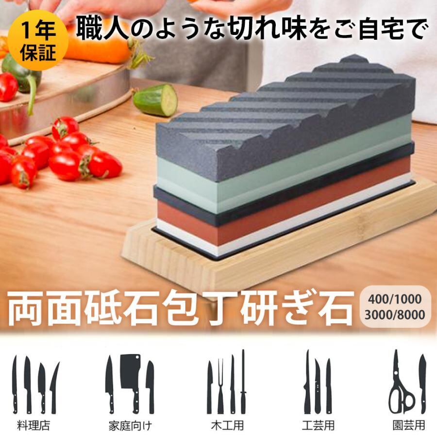 保証付 砥石 セット 包丁研ぎ石 両面砥石 包丁研ぎ砥石400/1000、3000/8000荒砥 中砥 仕上げ砥石 滑り止め竹砥石台 修正 砥石面 直し 角度固定ホルダー付き砥石