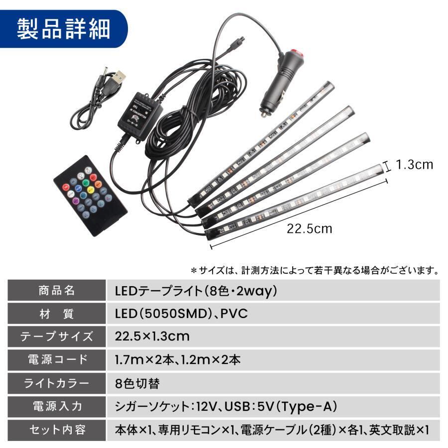 商品名 [8色 切替え] LED テープライト 車 車載 装飾 ランプ 車内 イルミネーション フットライト 調光 足下 照明 音に反応 お手軽 ドレスアップ 電球 ライト 選べる2タイプ シガーソケット USB リモコン付属