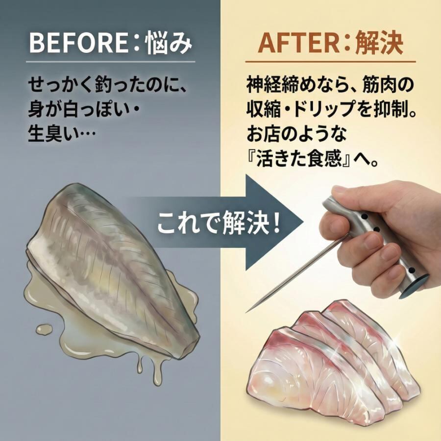 神経締め 脳締め 脳〆 フィッシュピック 魚の鮮度を保つ 血抜き 鮮度 大物 青物 ヒラメ 真鯛 マグロ エラ切り