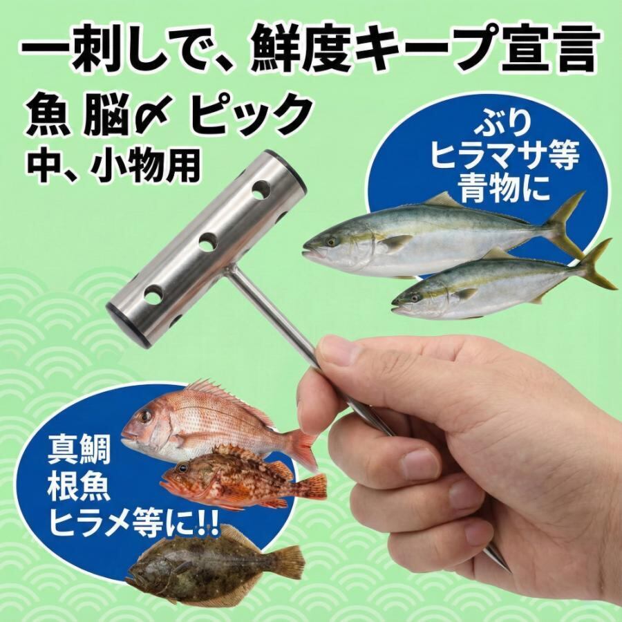 【注意事項】 先端は鋭く尖っております。取り扱いには十分にご注意ください。 お子様の手の届かない場所で保管してください。 【使用方法】 しめたい魚の頭にピックを挿します。 ピックをゆっくり回して、しめます。 魚が口を開けてピクピクなったらばっちりです。