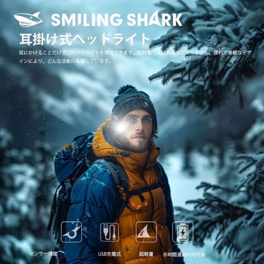 Smiling Shark LED ヘッドライト 耳掛け式 白光 赤光 耳装着式ヘッドランプ 懐中電灯 センサー付き USB充電 230°広角 超軽量 55g 防水 キャンプ 防災用
