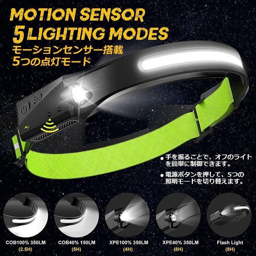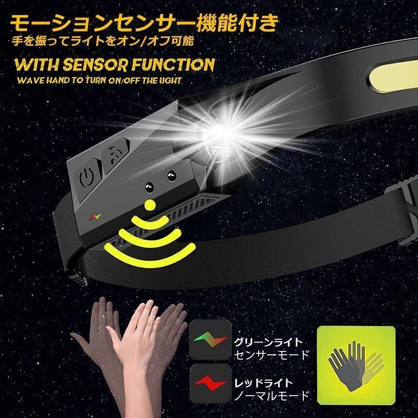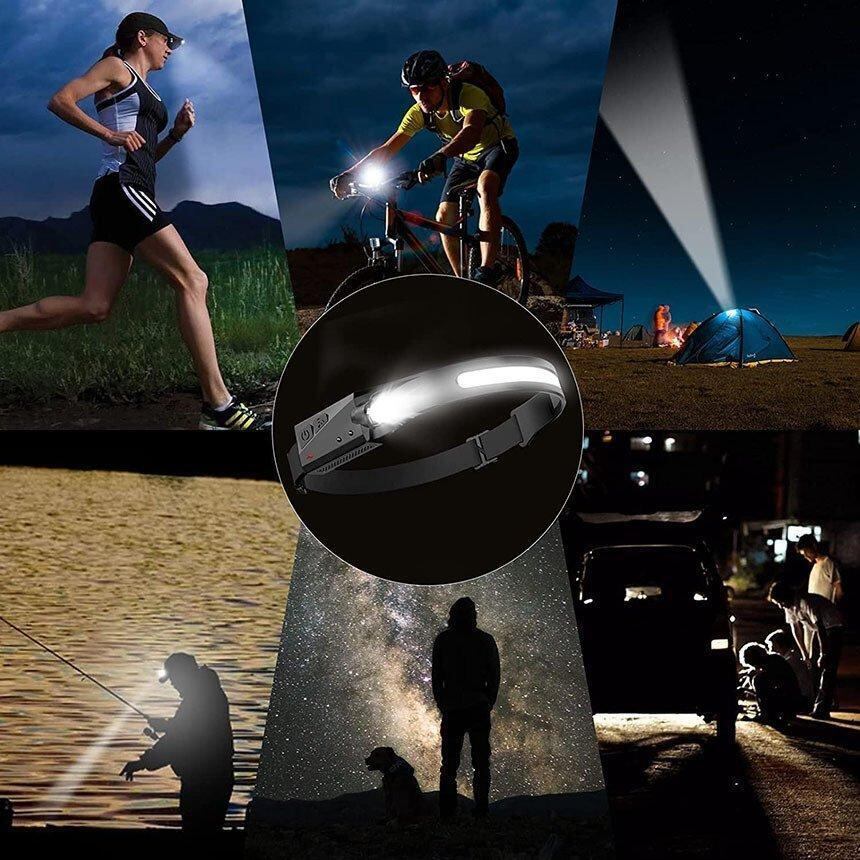 【高輝度&センシング人体センサー搭載】高品質LED搭載で光学凸レンズを採用し、均一な発光が届ける最大輝度350ルーメンの充電式ヘッドライトです。 照射距離最大約200メートルまで届けます。センシング機能が搭載している為、照明モードのまま、センサースイッチを押せばセンシングモードに入り、手をかざすだけで点灯/消灯が可能です。夜釣り、車の修理などの場合は非常に便利です。汚れた手で触る必要はありません。