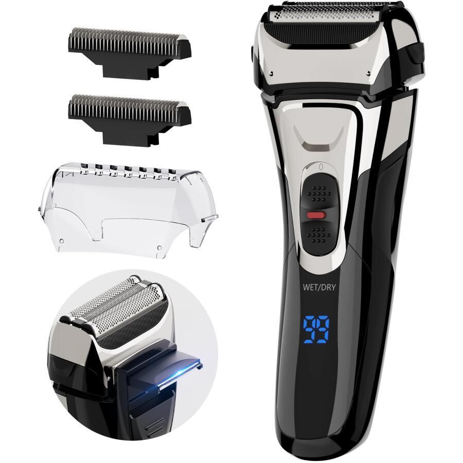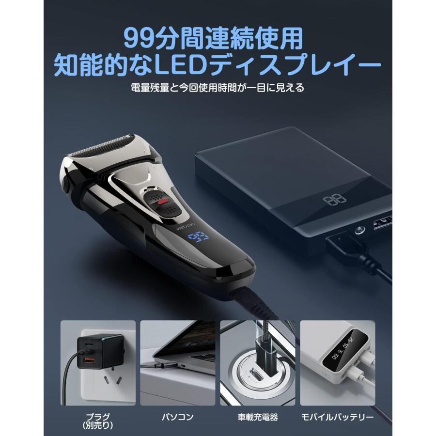 商品名:メンズシェーバー 髭剃り 電気シェーバー 電動 往復式 ひげそり 3枚刃 ウェット&ドライ お風呂剃り可 IPX7防水 LEDディスプレイ トリマー付き 替刃付き
