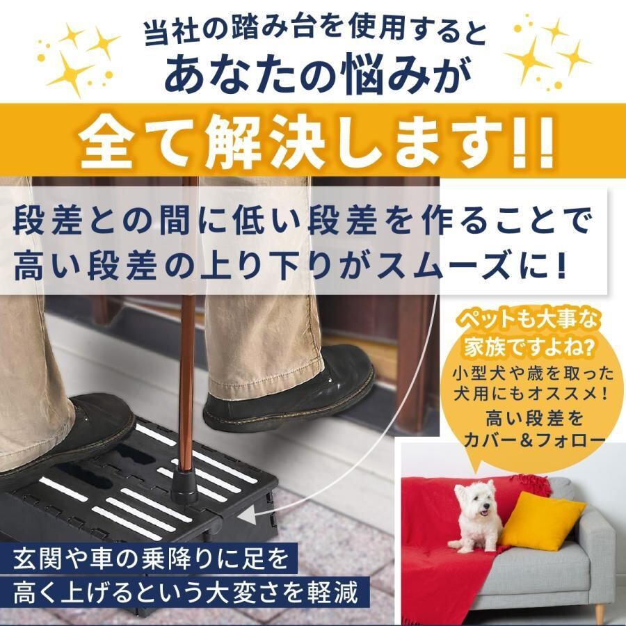 高齢者やカラダの不自由な方、妊娠されている方、車の乗り降りや家の中の玄関、ベランダ、お風呂での段差解消、 またリビングでは脚の置き場など様々なシーンでご利用いただけます。足の置き場にはラバー製の滑り止めがついており安心してご使用いただけます