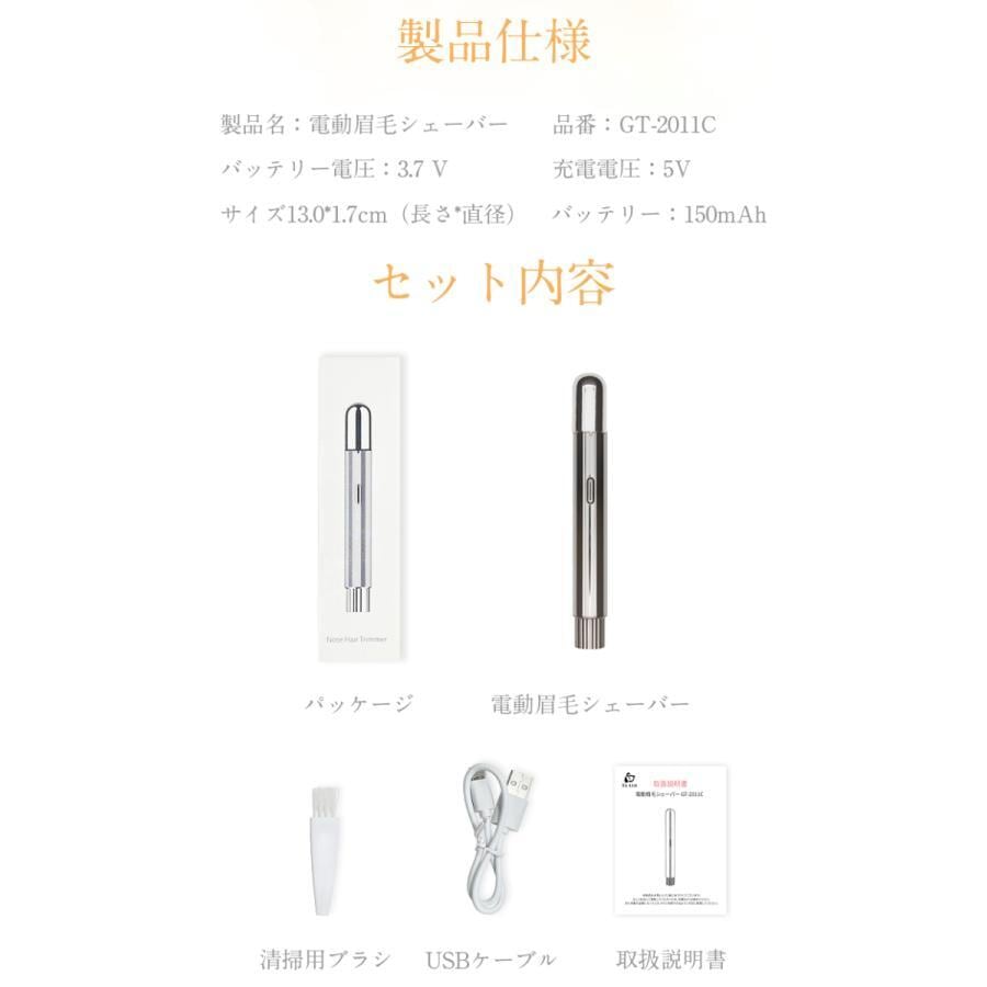 【パッケージ内容】電動眉毛シェーバー本体*1、充電ケーブル*1、取扱説明書*1。