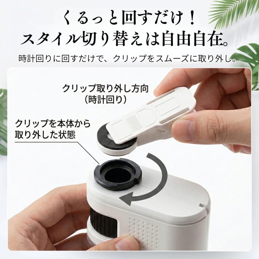 本製品はクリップが取り外し可能な構造になっており、レンズ単体として使用することで、手持ちの簡易顕微鏡として観察することも可能です。対象物に直接近づけて使用することで、スマートフォンを使わずに細部の確認にもご活用いただけます。