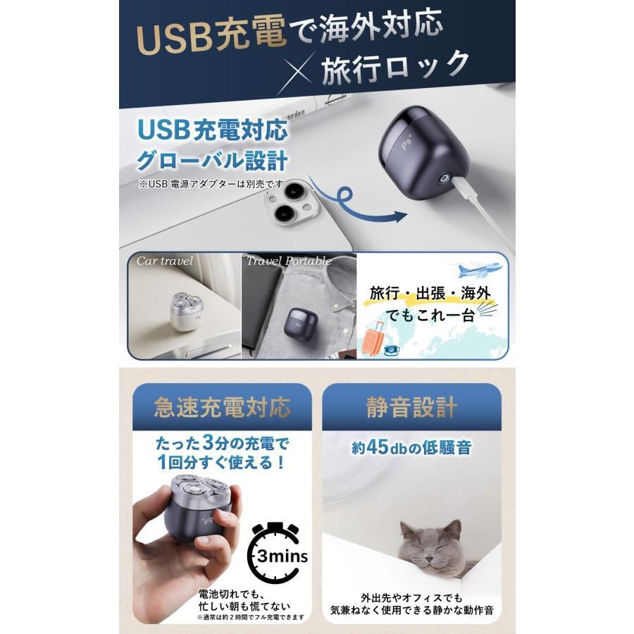 ひげそり 電動シェーバー メンズ 小型 360°回転式 フローティング 3枚刃 乾湿両用 IPX7 メタルボディ 低振動 静音 USB-C急速充電 専用ブラシ付きお手入れ簡単